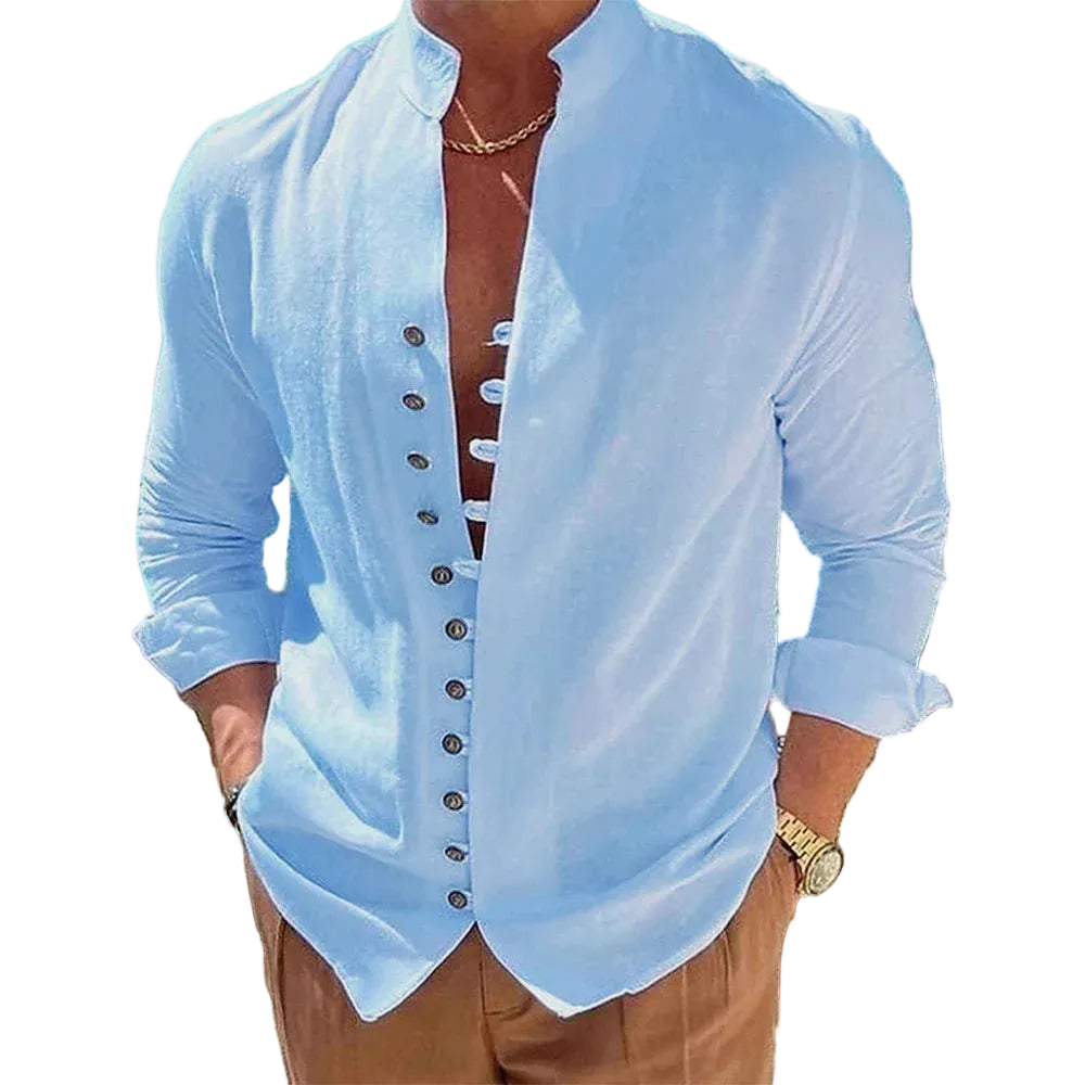 Stay cool and stylish with this men’s stand-up collar linen shirt. Crafted from breathable, lightweight linen, it provides all-day comfort while maintaining a crisp, modern look. The stand-up collar adds a subtle, sophisticated touch, making it ideal for casual, summer, or smart-casual occasions.